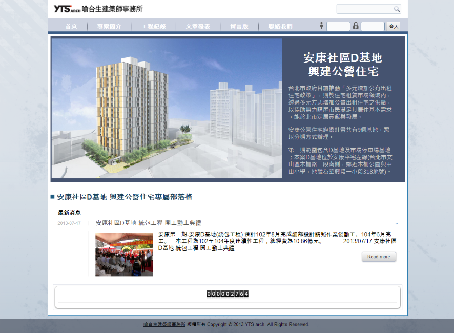 系統說明本網站為一建築師事務所之官方網站,包含事務所簡介、榮譽與獲獎、工程實績、下載區、遊憩小記、教育訓練、全站搜尋、流量統計等功能,登入系統後,將可進入需要授權的專案管理介面,提供員工、業主一個資訊交流的共通平台。 |