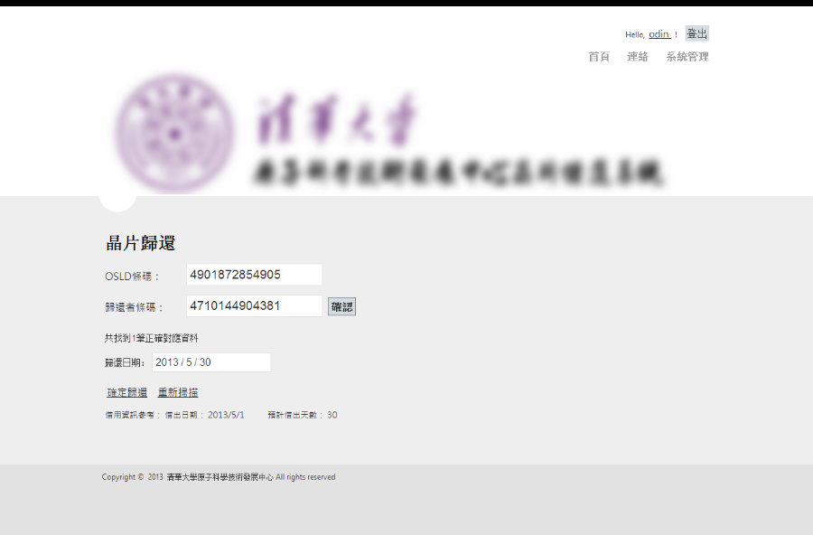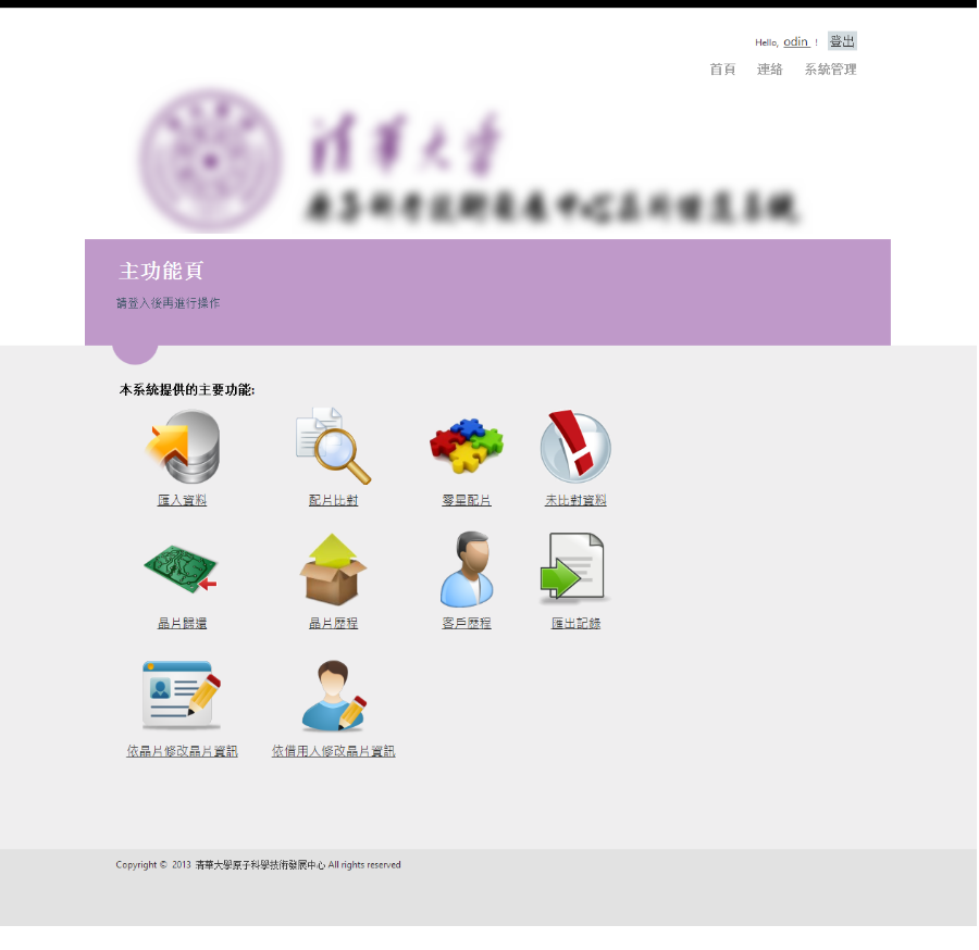系統說明本系統主要提供晶片借還的比對,透過Excel輸入配片資訊,結合條碼掃描機與條碼系統進行配片作業,以最迅速的方法處理每個月的晶片借還作業,此外,透過本系統尚能檢閱晶片的借還歷程以及人員的借還記錄,以利整理出尚未歸還的晶片與尚未歸還晶片的人員,藉由此系統大幅增加作業人員的效率與降低配片錯誤率。 |