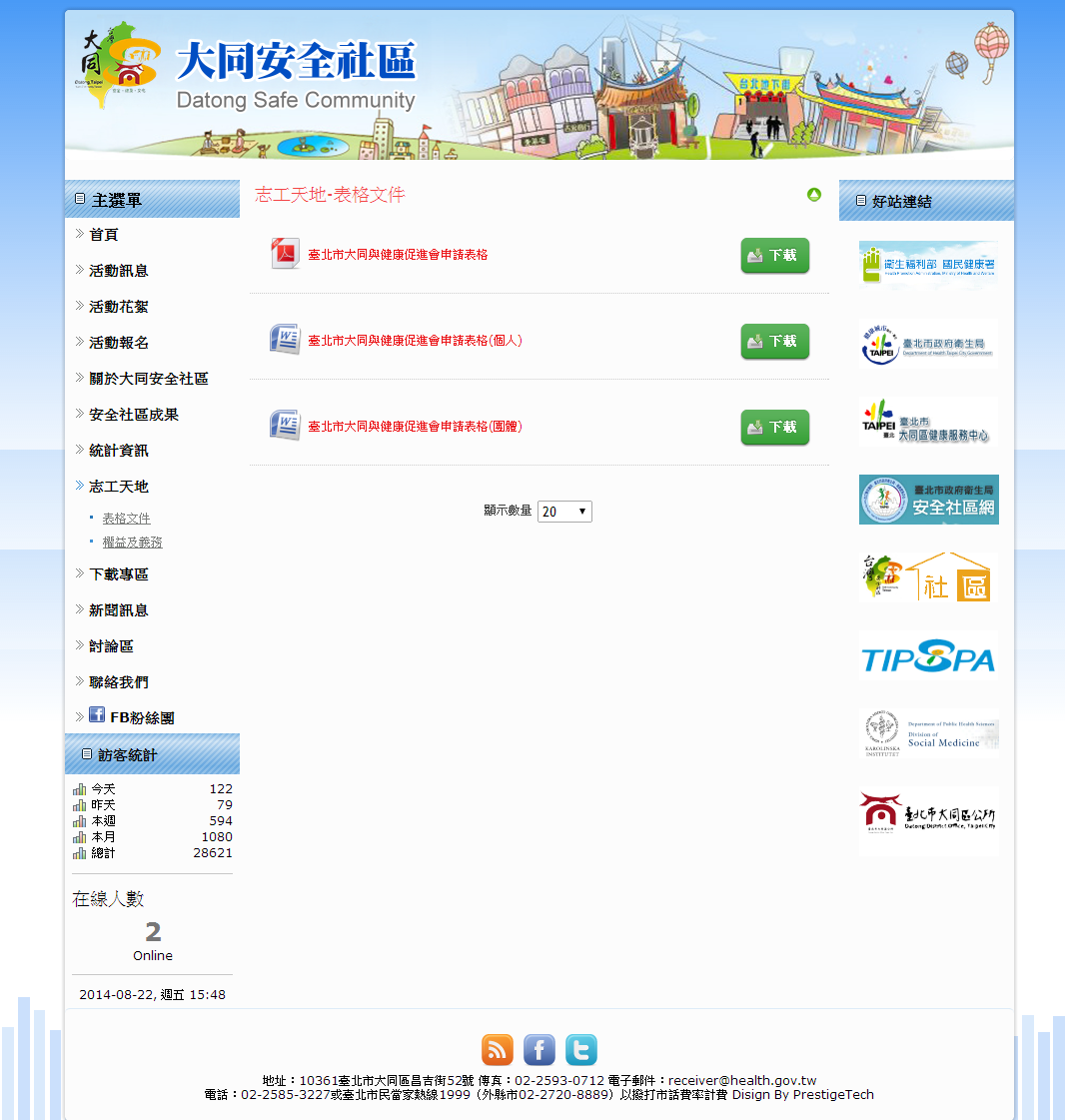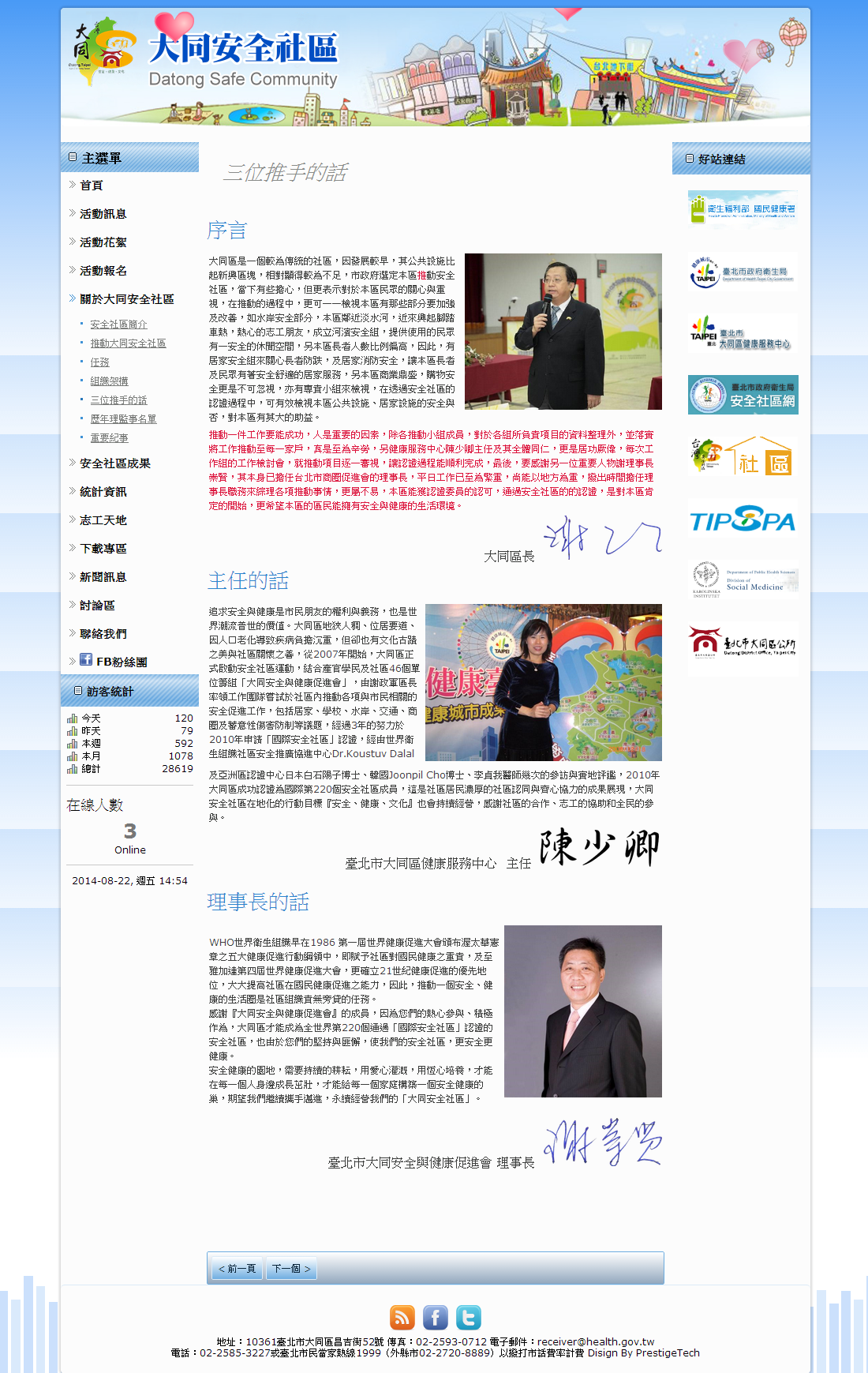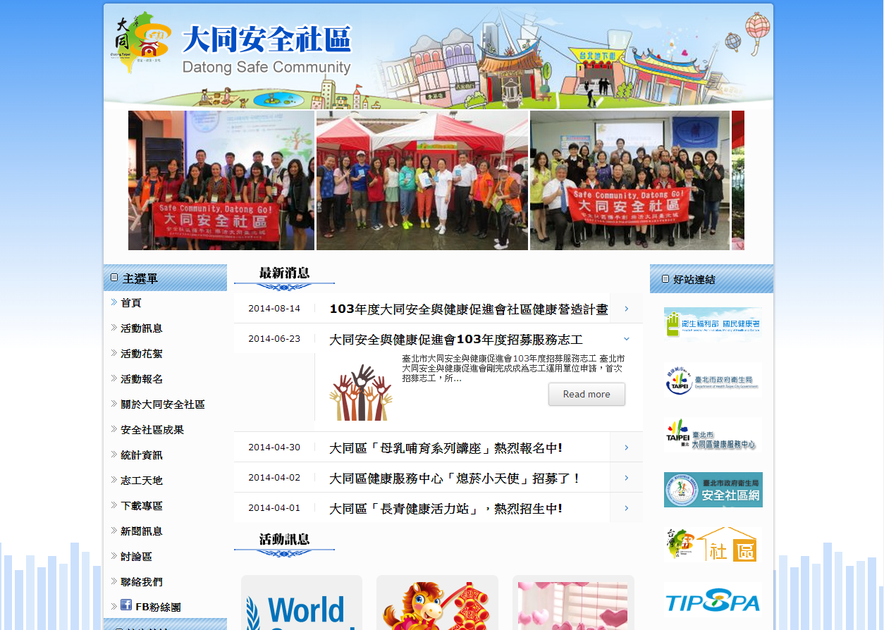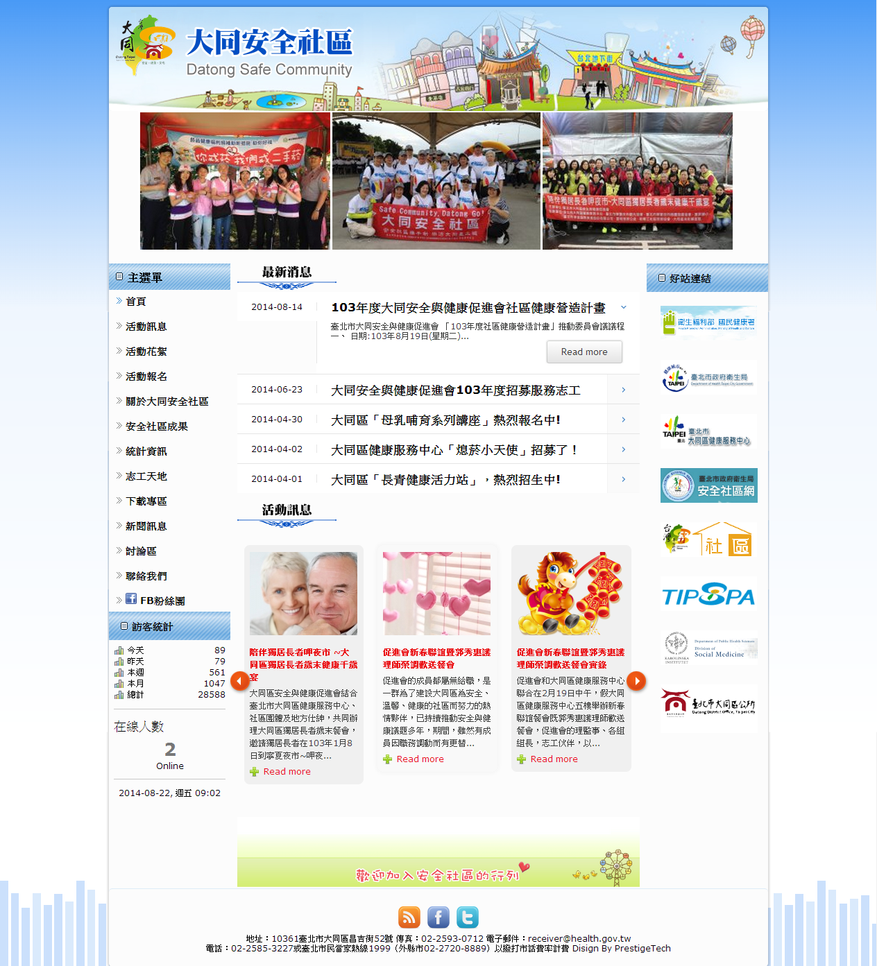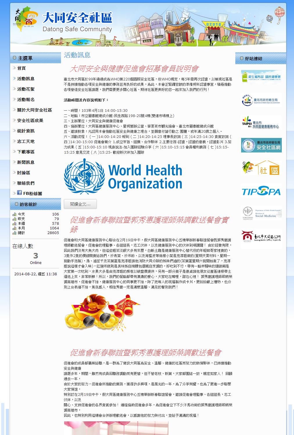 系統說明本系統為一非政府組織的網站,網站內容包含最新活動、最新消息、活動花絮、安全社區成果、統計資訊、志工天地、下載專區、新聞訊息、意見信箱、聯絡我們等區塊,透過此系統,促進會的幹部與民眾能夠進行資訊的交流,以活絡健康促進發展的績效。 |