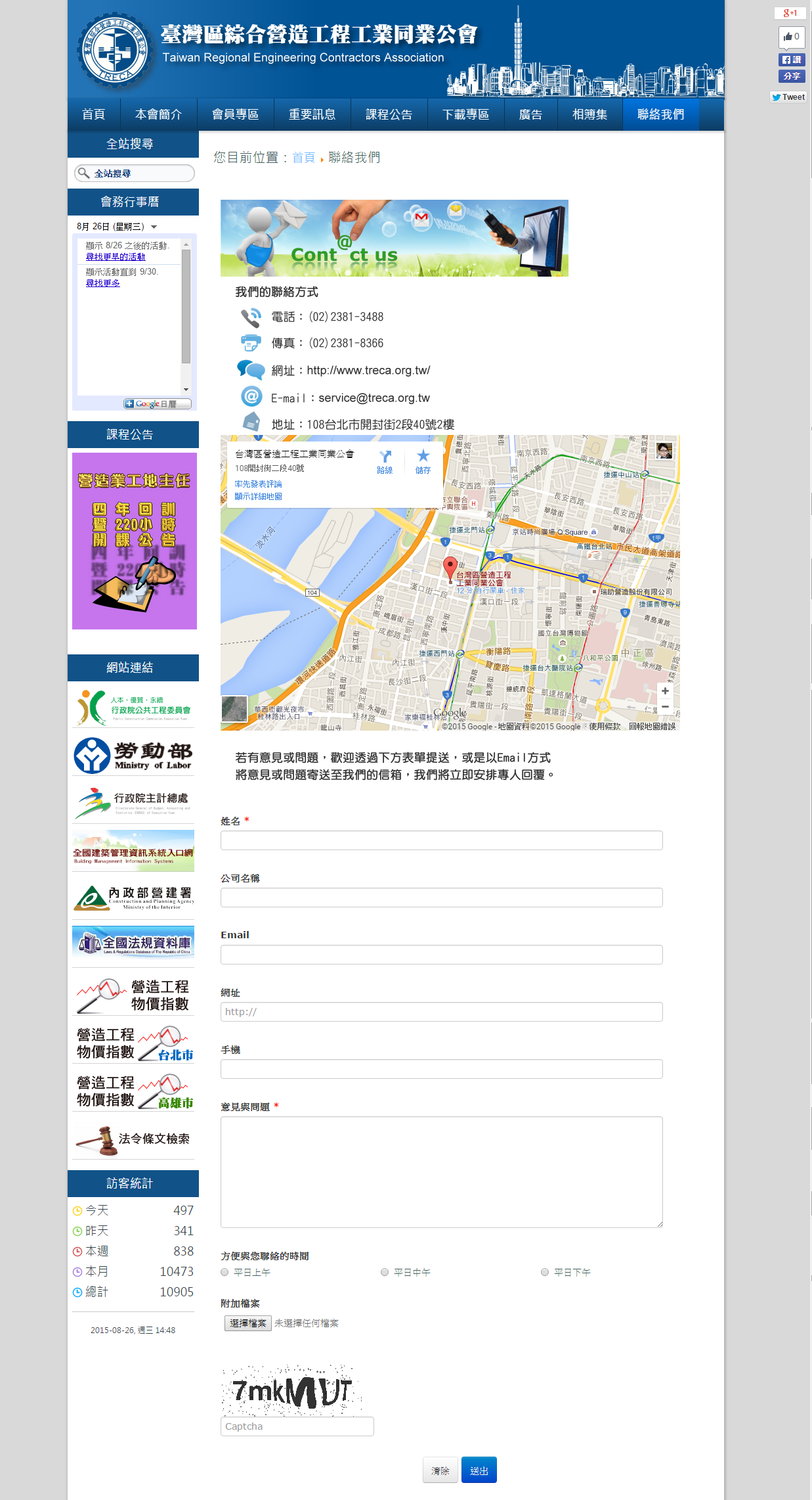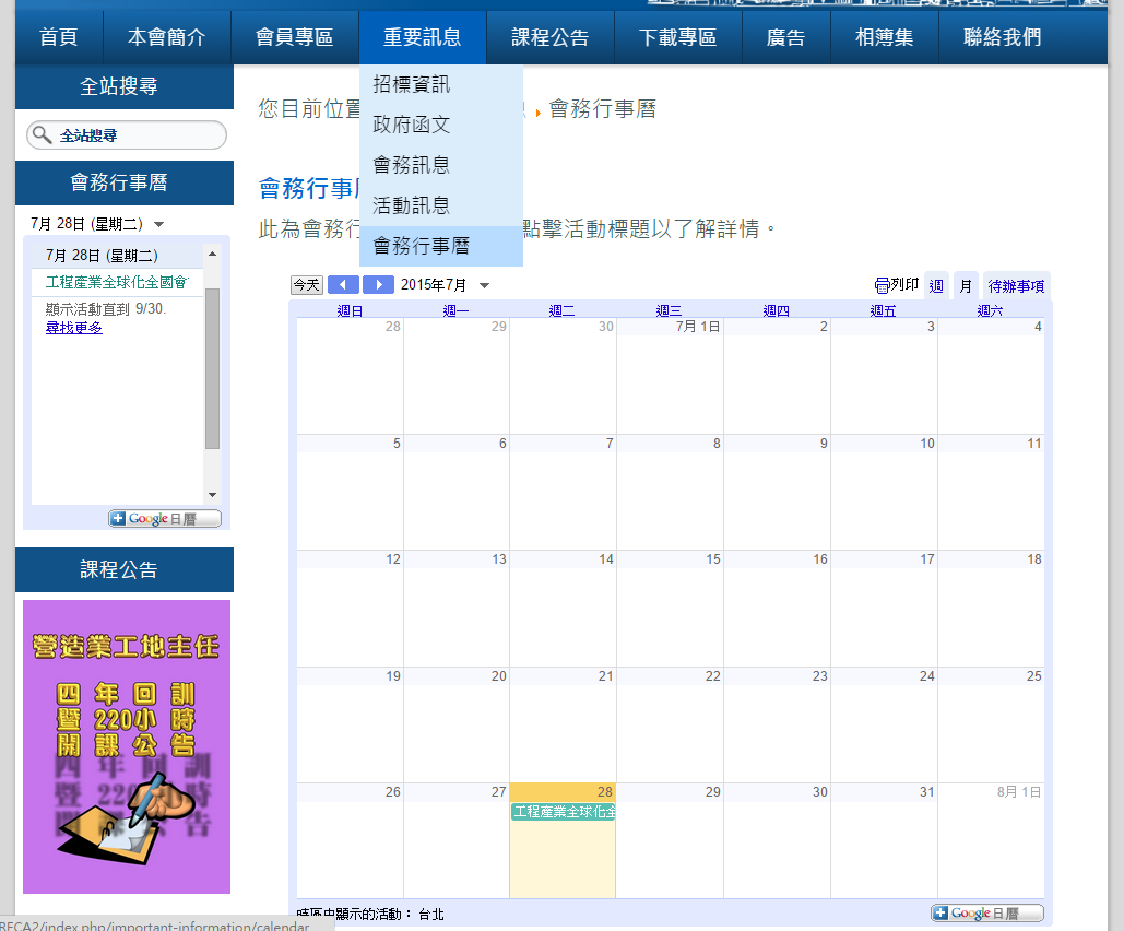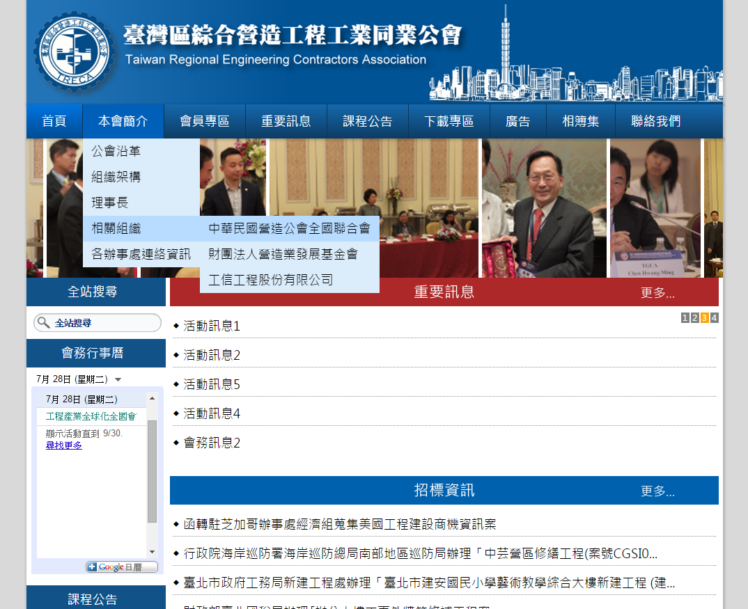 系統說明本系統為一同業公會的網站,網站內容包含最新活動、最新消息、關於公會、重要訊息、招標資訊、政府函文、活動訊息、網站連結、課程公告、訪客統計等區塊,除此之外,此網站與Google日曆緊密結合,透過此系統,所有會員間與公會能夠進行資訊的交流,以活絡會務發展的績效。 |