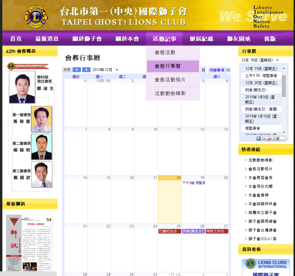 系統說明本系統為一國際獅子會的網站,網站內容包含最新活動、最新消息、關於獅子會、活動記事、歷屆紀錄、獅友園地等區塊,除此之外,此網站與Google日曆及Youtube頻道緊密結合,透過此系統,獅子會的會員間能夠進行資訊的交流,以活絡會務發展的績效。 |