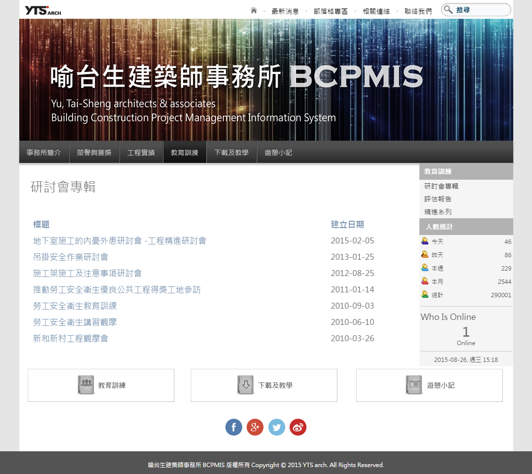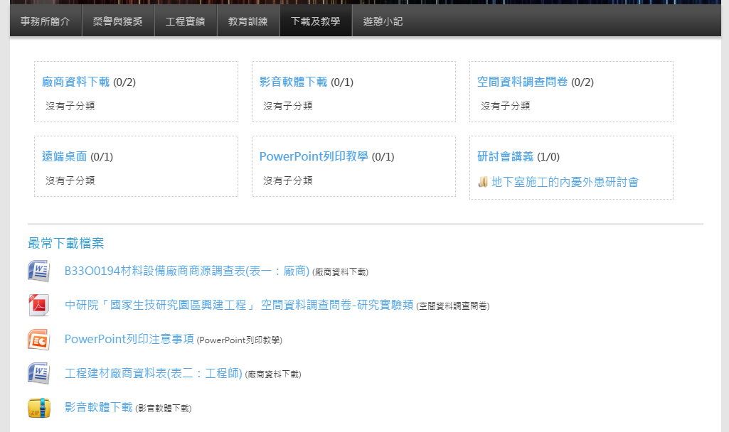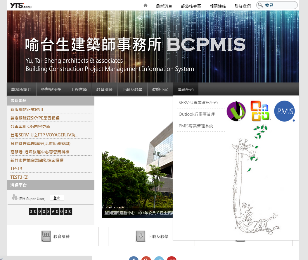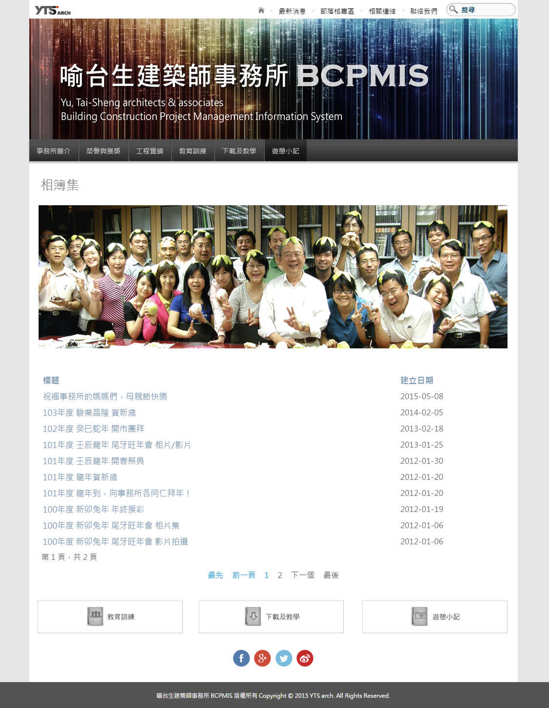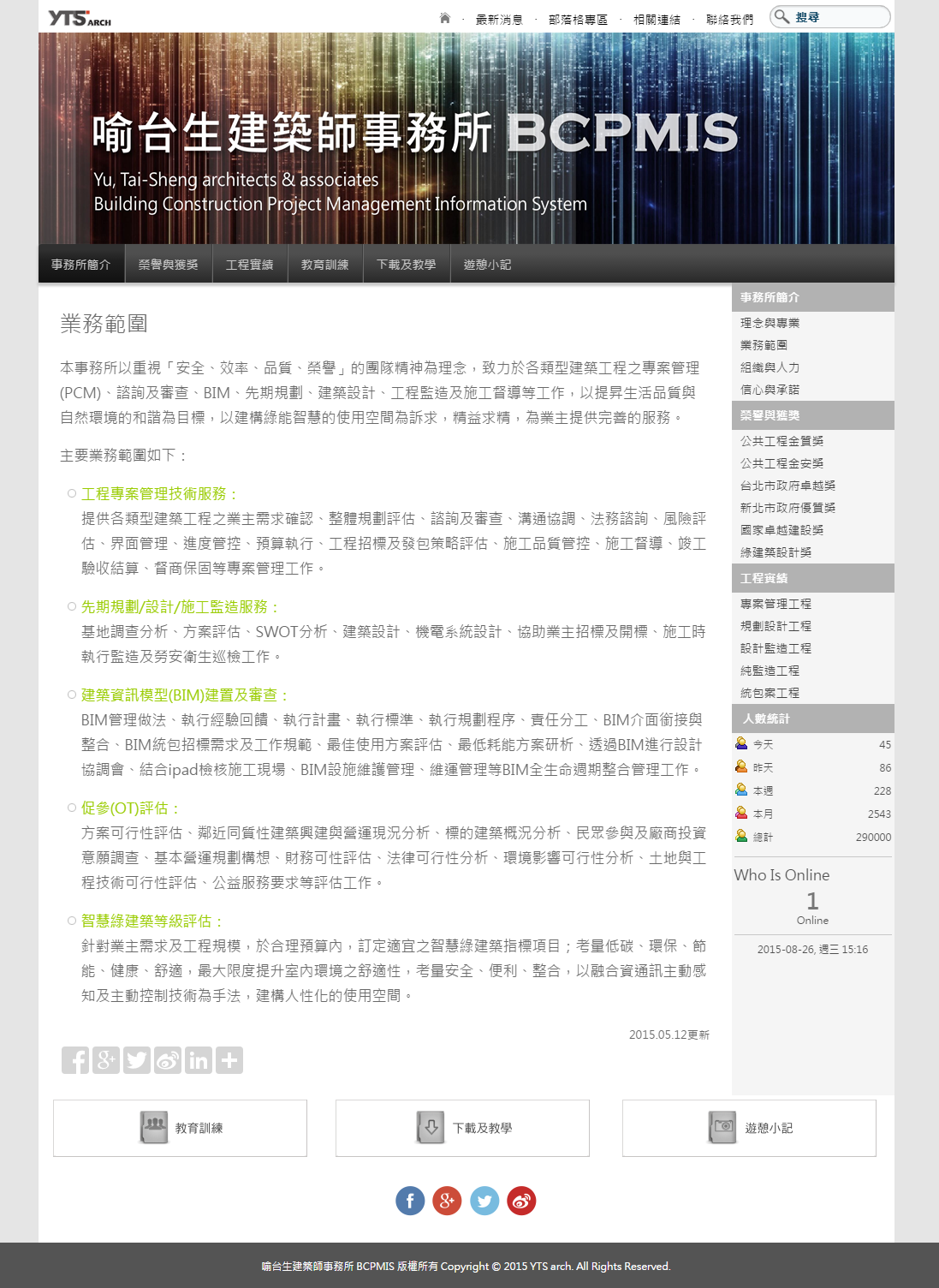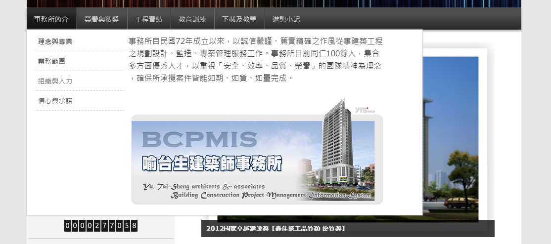 系統說明本網站為一建築師事務所之官方網站,包含事務所簡介、榮譽與獲獎、工程實績、下載區、遊憩小記、教育訓練、全站搜尋、流量統計等功能,登入系統後,將可進入需要授權的專案管理介面,提供員工、業主一個資訊交流的共通平台。 |